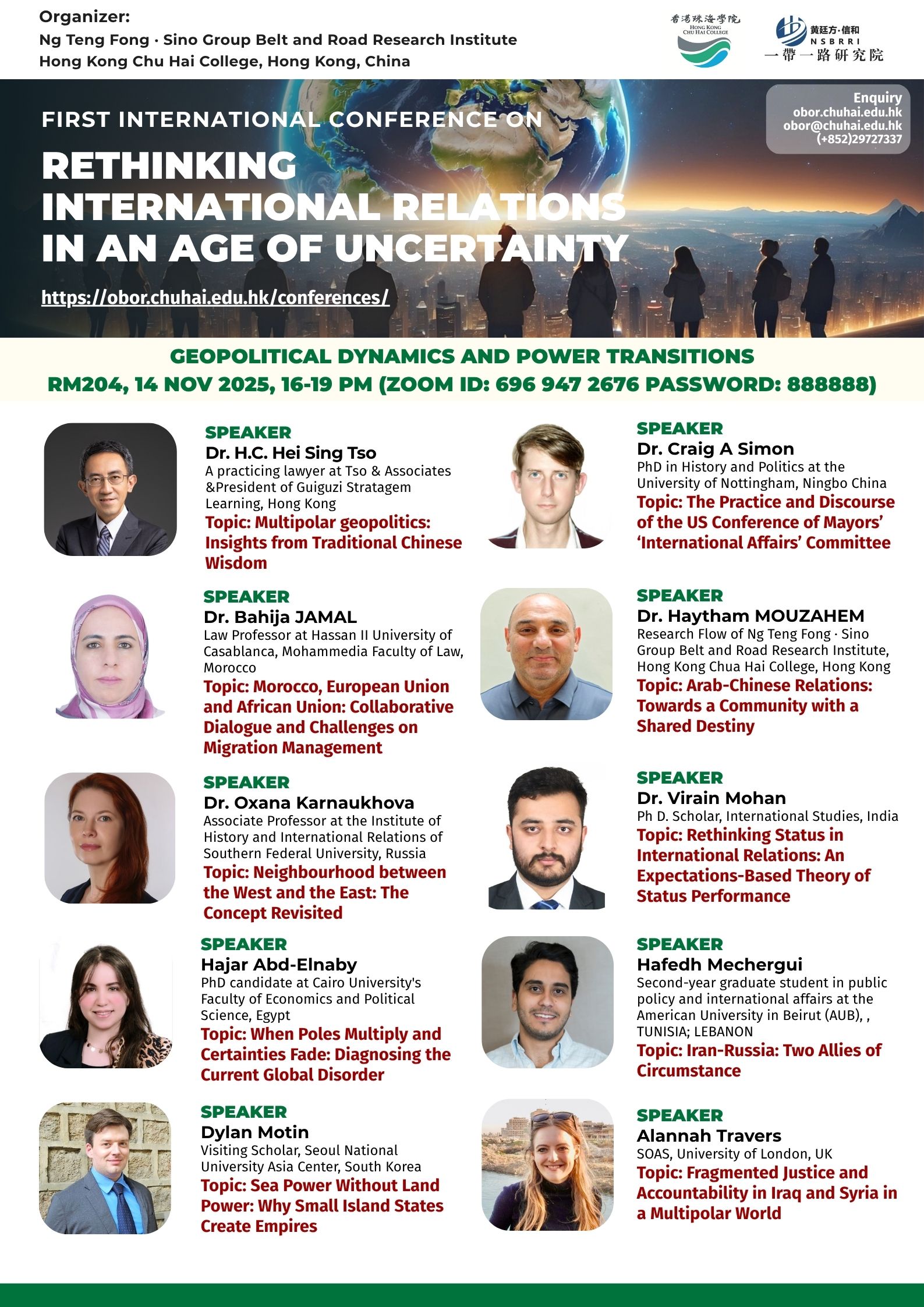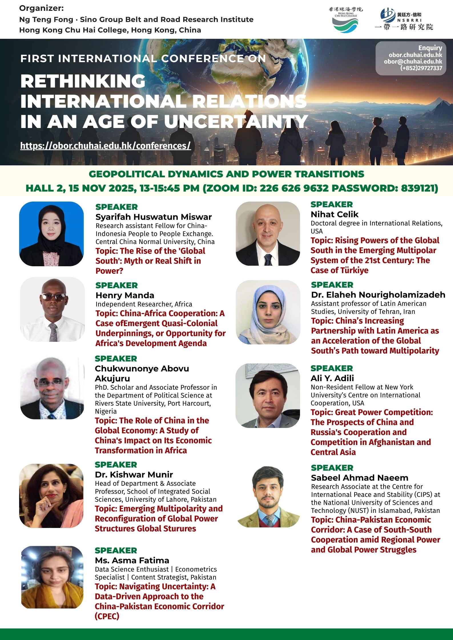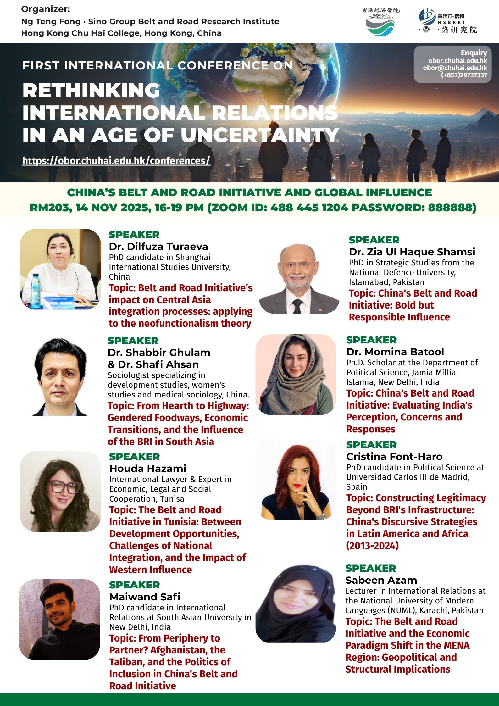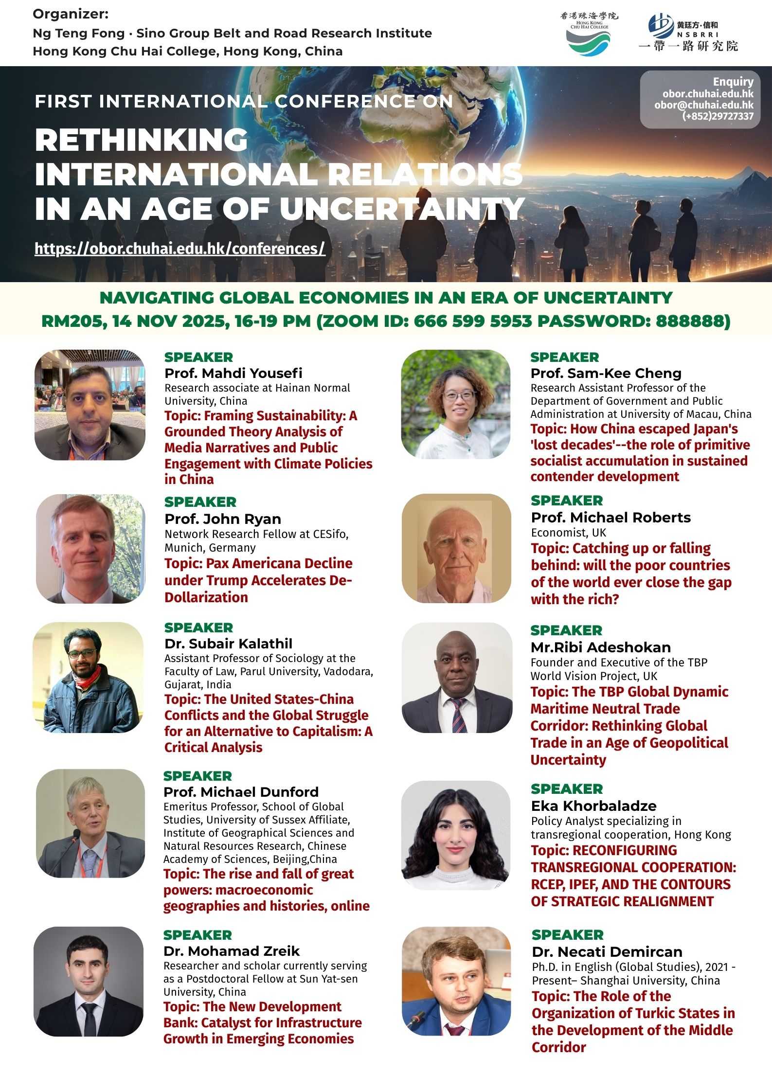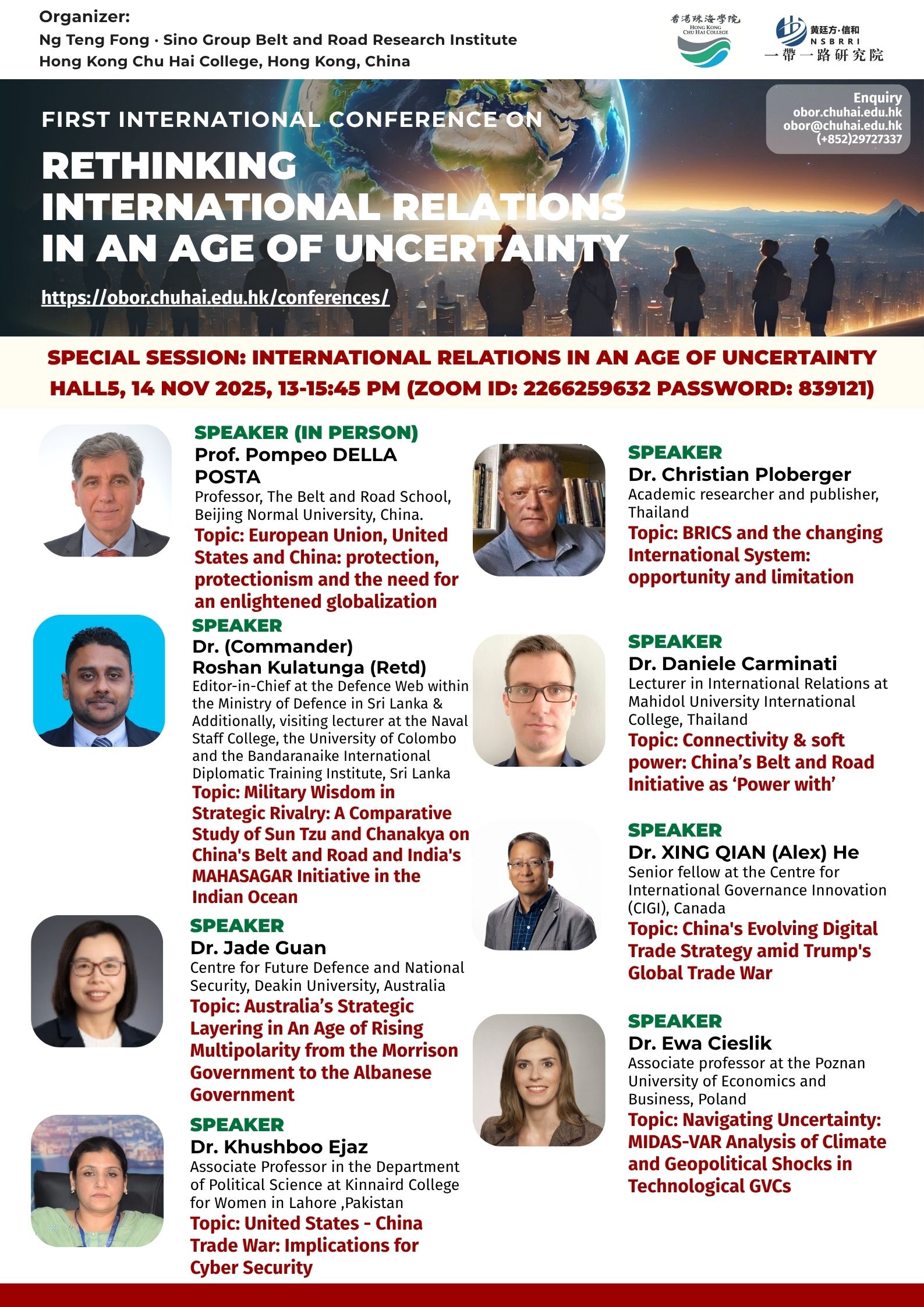 ——————————— Audiences Registration for the Conference We are delighted to offer free participation for all audience members at the First International Conference on Rethinking International Relations in an Age of Uncertainty. There are no registration fees for attending either in person or online, ensuring broad accessibility to this enriching academic event. To secure your spot as an audience member, please complete the registration form below: Audience Registration In-Person Attendance: Early registration is highly recommended to facilitate planning. The deadline for in-person registration is 12 November 2025. Upon successful attendance, we will issue an official Certificate of Participation to acknowledge your engagement. Online Attendance: Registration remains open beyond this date. We will distribute the access code and Zoom links for all sessions closer to the conference dates (14–15 November 2025). Panel links will be shared with all registered audience members. In line with our mission to foster open dialogue and knowledge exchange, we invite you to share the Zoom session links with your professional network to amplify the conference’s reach and impact. Should you have any inquiries or feedback, please do not hesitate to contact us at obor.events@chuhai.edu.hk ——————————— Information Kit for Overseas Participants Please download the information kit for your reference: Information Kit ——————————— Collect Presenter’s Materials For accepted presenters, please upload your presentation materials to the google form before 30 Oct 2025 17:00: https://forms.gle/uPFd6ro64UrRejiS6 ——————————— Visa Application For applying a visit/ transit visa/entry permit for Hong Kong SAR, applicant may submit their application by one of the following means: Online Submission Click here for online submission of application and uploading of supporting documents. Other Means of Submission Completed application forms, i.e. ID 1003A and ID 1003B (if applicable), and all supporting documents can also be submitted by the applicant or the local sponsor in either one of the following ways. All the forms must be duly completed and signed. For an applicant under the age of 16, it must be signed by the parent or legal guardian of the child.