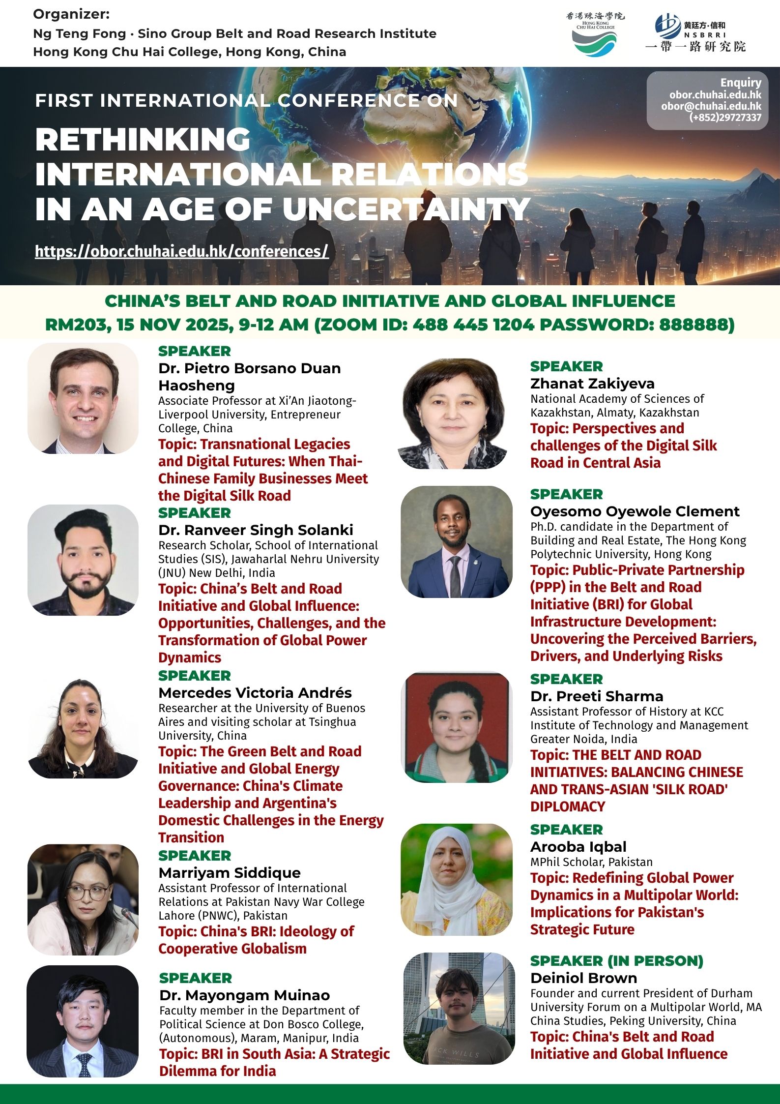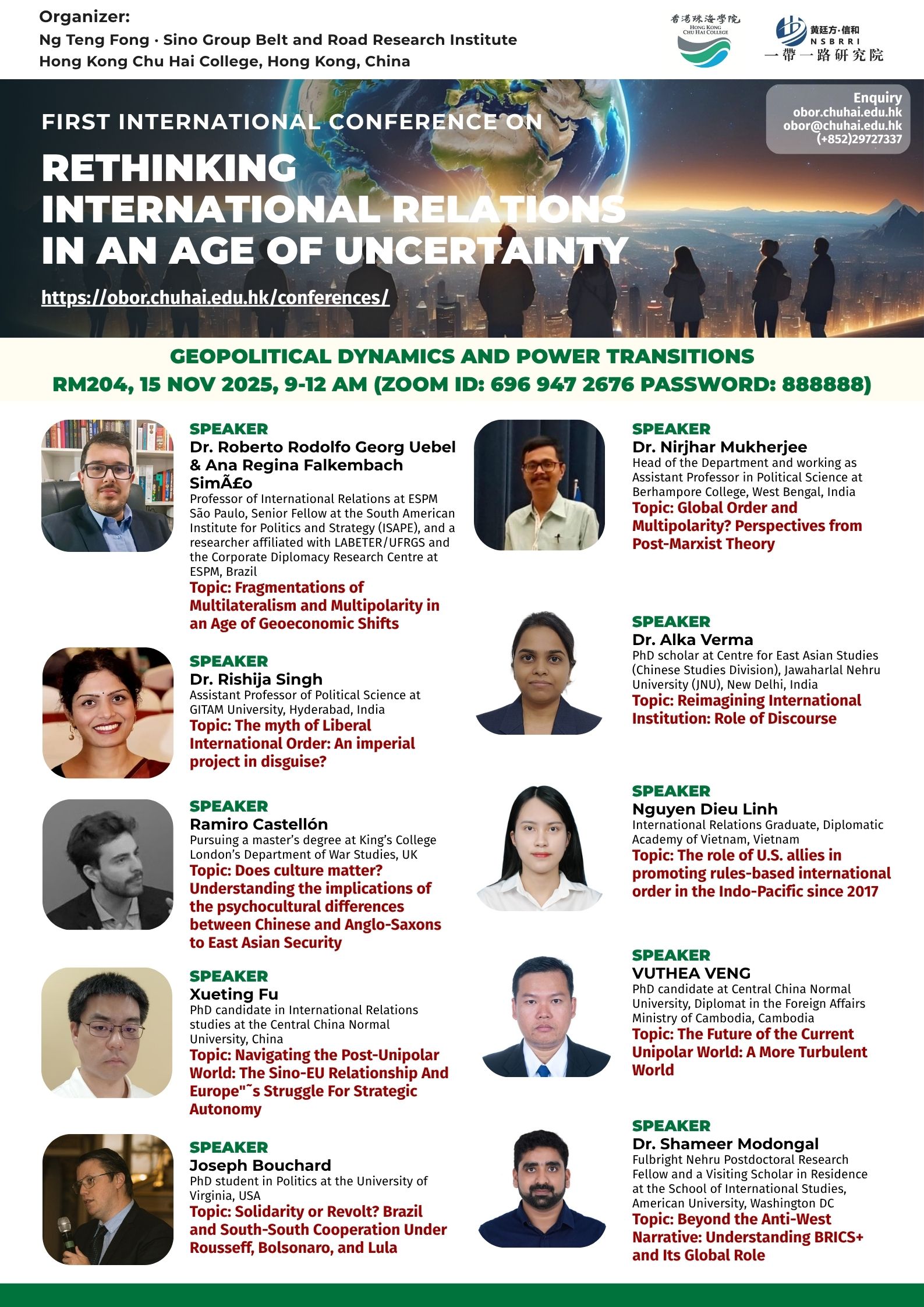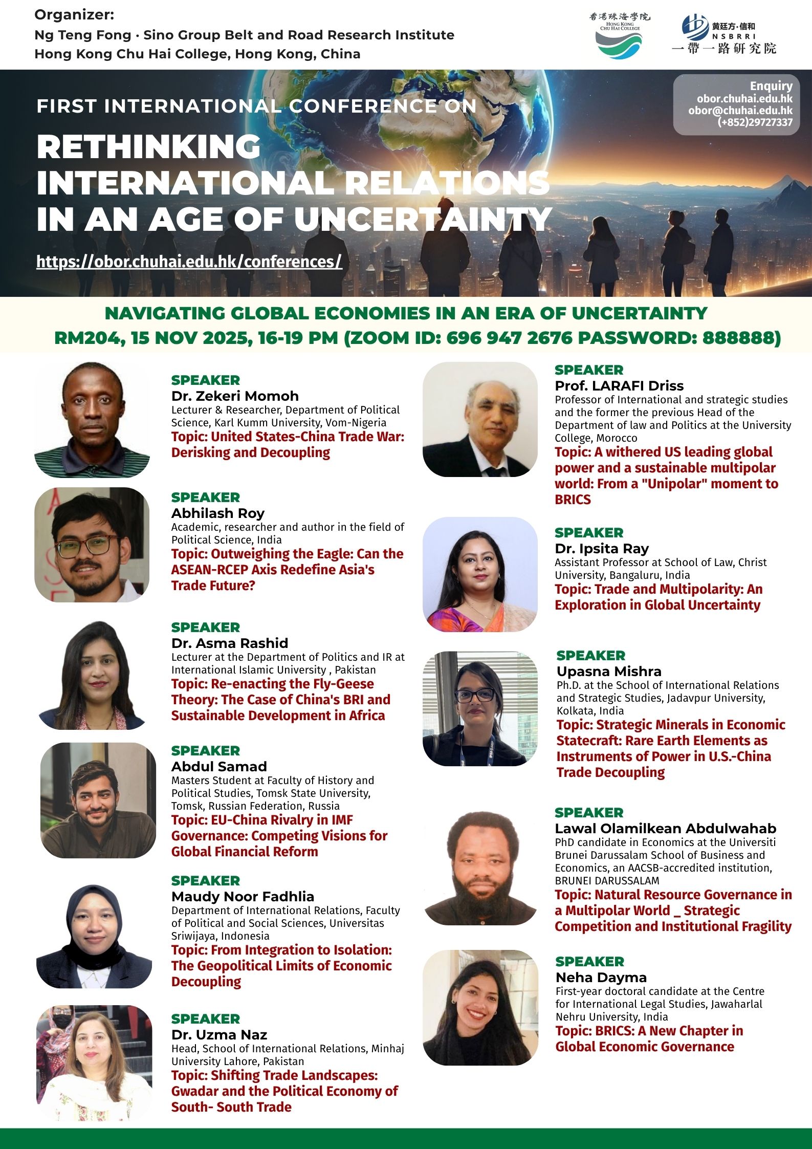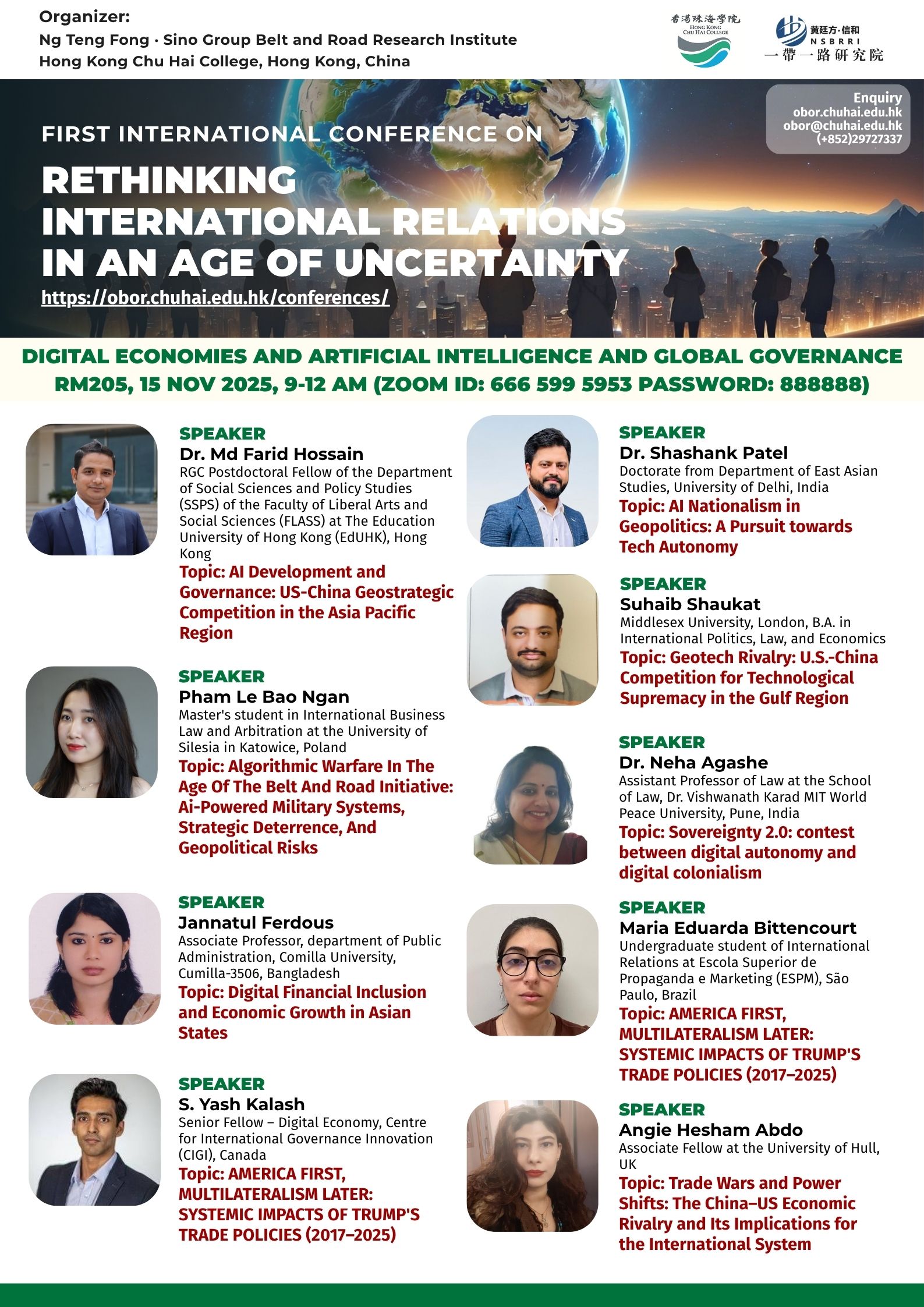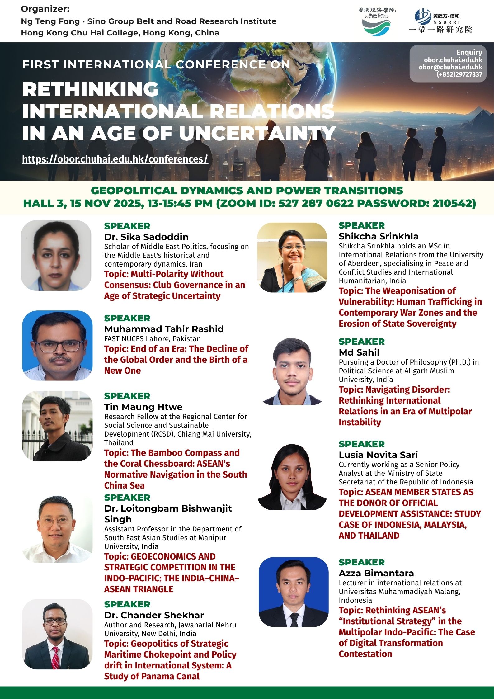 ——————————— Audiences Registration for the Conference We are delighted to offer free participation for all audience members at the First International Conference on Rethinking International Relations in an Age of Uncertainty. There are no registration fees for attending either in person or online, ensuring broad accessibility to this enriching academic event. To secure your spot as an audience member, please complete the registration form below: Audience Registration In-Person Attendance: Early registration is highly recommended to facilitate planning. The deadline for in-person registration is 12 November 2025. Upon successful attendance, we will issue an official Certificate of Participation to acknowledge your engagement. Online Attendance: Registration remains open beyond this date. We will distribute the access code and Zoom links for all sessions closer to the conference dates (14–15 November 2025). Panel links will be shared with all registered audience members. In line with our mission to foster open dialogue and knowledge exchange, we invite you to share the Zoom session links with your professional network to amplify the conference’s reach and impact. Should you have any inquiries or feedback, please do not hesitate to contact us at obor.events@chuhai.edu.hk ——————————— Information Kit for Overseas Participants Please download the information kit for your reference: Information Kit ——————————— Collect Presenter’s Materials For accepted presenters, please upload your presentation materials to the google form before 30 Oct 2025 17:00: https://forms.gle/uPFd6ro64UrRejiS6 ——————————— Visa Application For applying a visit/ transit visa/entry permit for Hong Kong SAR, applicant may submit their application by one of the following means: Online Submission Click here for online submission of application and uploading of supporting documents. Other Means of Submission Completed application forms, i.e. ID 1003A and ID 1003B (if applicable), and all supporting documents can also be submitted by the applicant or the local sponsor in either one of the following ways. All the forms must be duly completed and signed. For an applicant under the age of 16, it must be signed by the parent or legal guardian of the child.