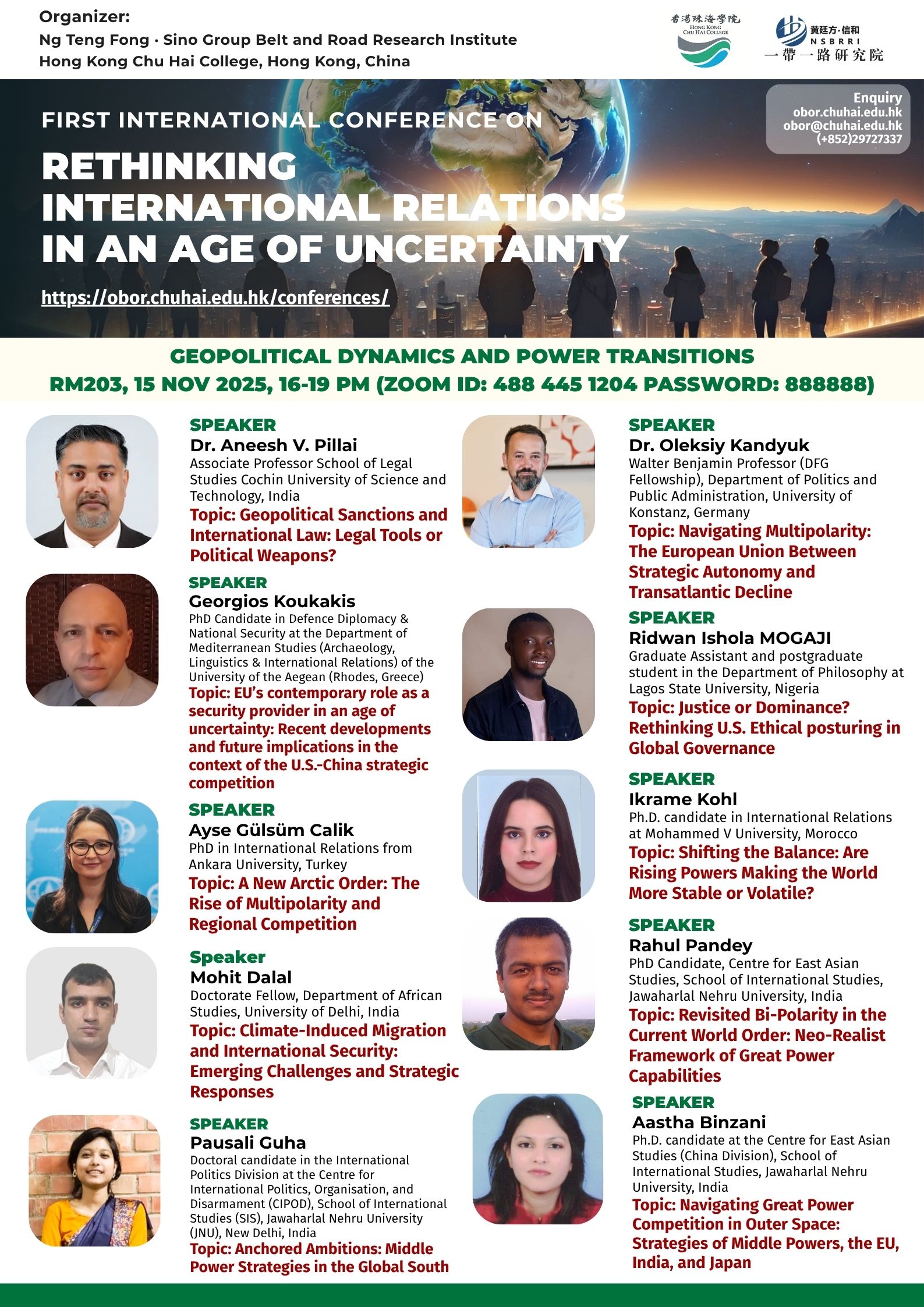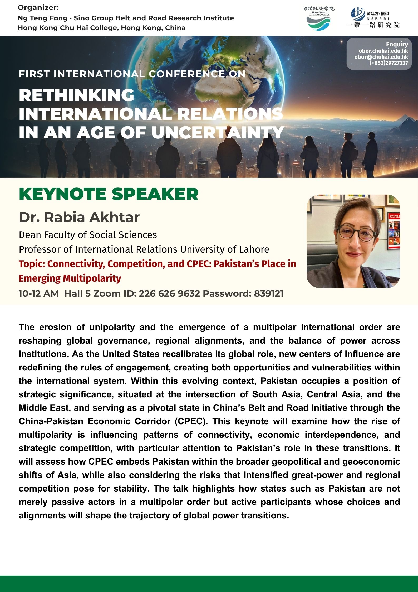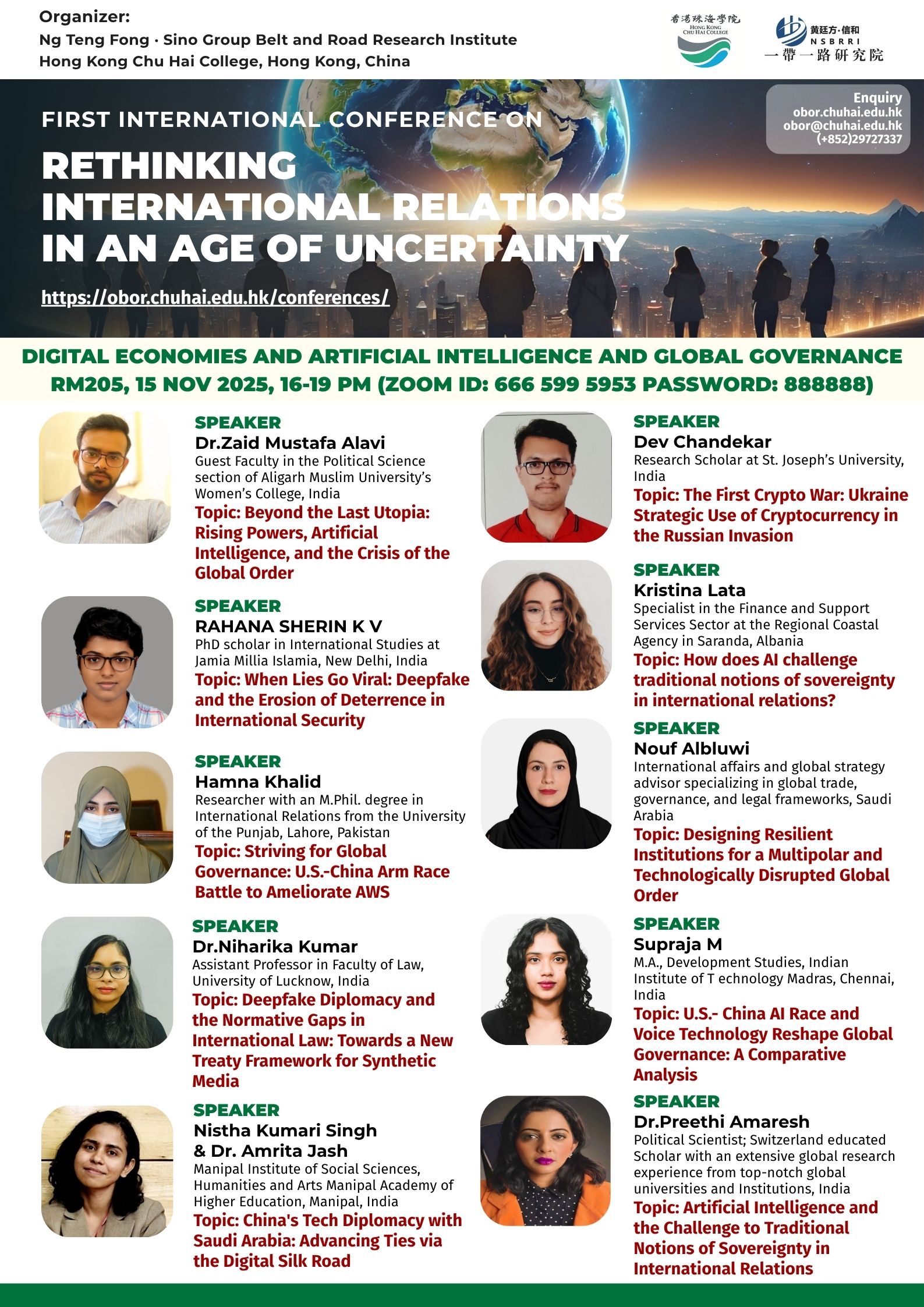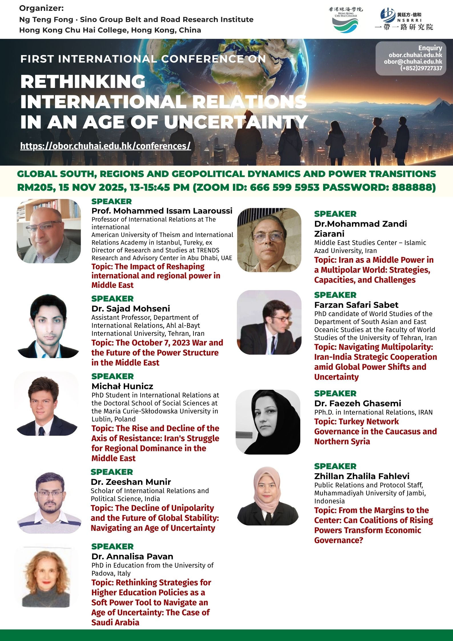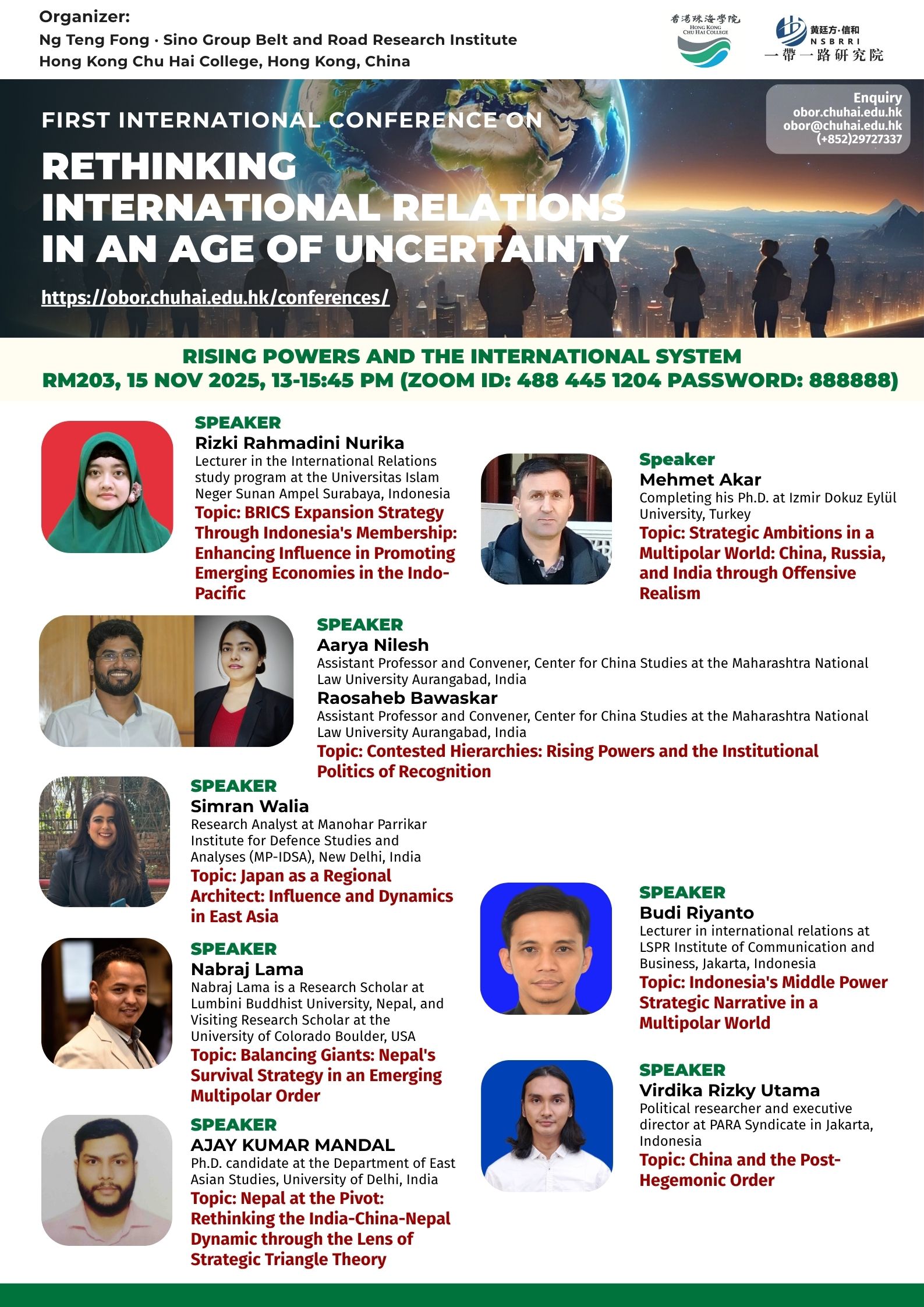 ——————————— Audiences Registration for the Conference We are delighted to offer free participation for all audience members at the First International Conference on Rethinking International Relations in an Age of Uncertainty. There are no registration fees for attending either in person or online, ensuring broad accessibility to this enriching academic event. To secure your spot as an audience member, please complete the registration form below: Audience Registration In-Person Attendance: Early registration is highly recommended to facilitate planning. The deadline for in-person registration is 12 November 2025. Upon successful attendance, we will issue an official Certificate of Participation to acknowledge your engagement. Online Attendance: Registration remains open beyond this date. We will distribute the access code and Zoom links for all sessions closer to the conference dates (14–15 November 2025). Panel links will be shared with all registered audience members. In line with our mission to foster open dialogue and knowledge exchange, we invite you to share the Zoom session links with your professional network to amplify the conference’s reach and impact. Should you have any inquiries or feedback, please do not hesitate to contact us at obor.events@chuhai.edu.hk ——————————— Information Kit for Overseas Participants Please download the information kit for your reference: Information Kit ——————————— Collect Presenter’s Materials For accepted presenters, please upload your presentation materials to the google form before 30 Oct 2025 17:00: https://forms.gle/uPFd6ro64UrRejiS6 ——————————— Visa Application For applying a visit/ transit visa/entry permit for Hong Kong SAR, applicant may submit their application by one of the following means: Online Submission Click here for online submission of application and uploading of supporting documents. Other Means of Submission Completed application forms, i.e. ID 1003A and ID 1003B (if applicable), and all supporting documents can also be submitted by the applicant or the local sponsor in either one of the following ways. All the forms must be duly completed and signed. For an applicant under the age of 16, it must be signed by the parent or legal guardian of the child.