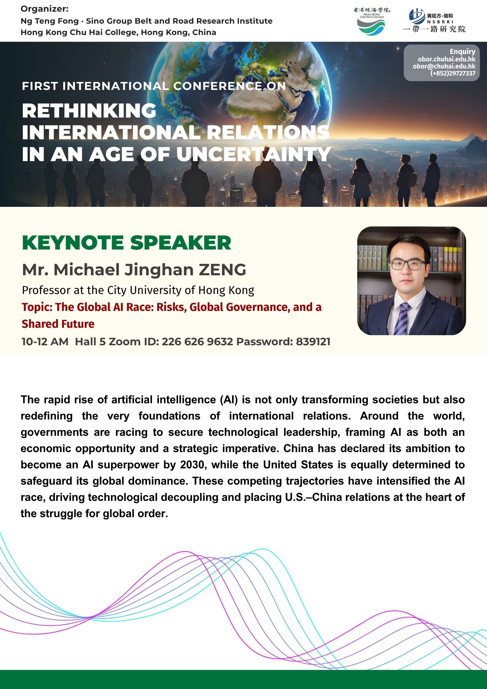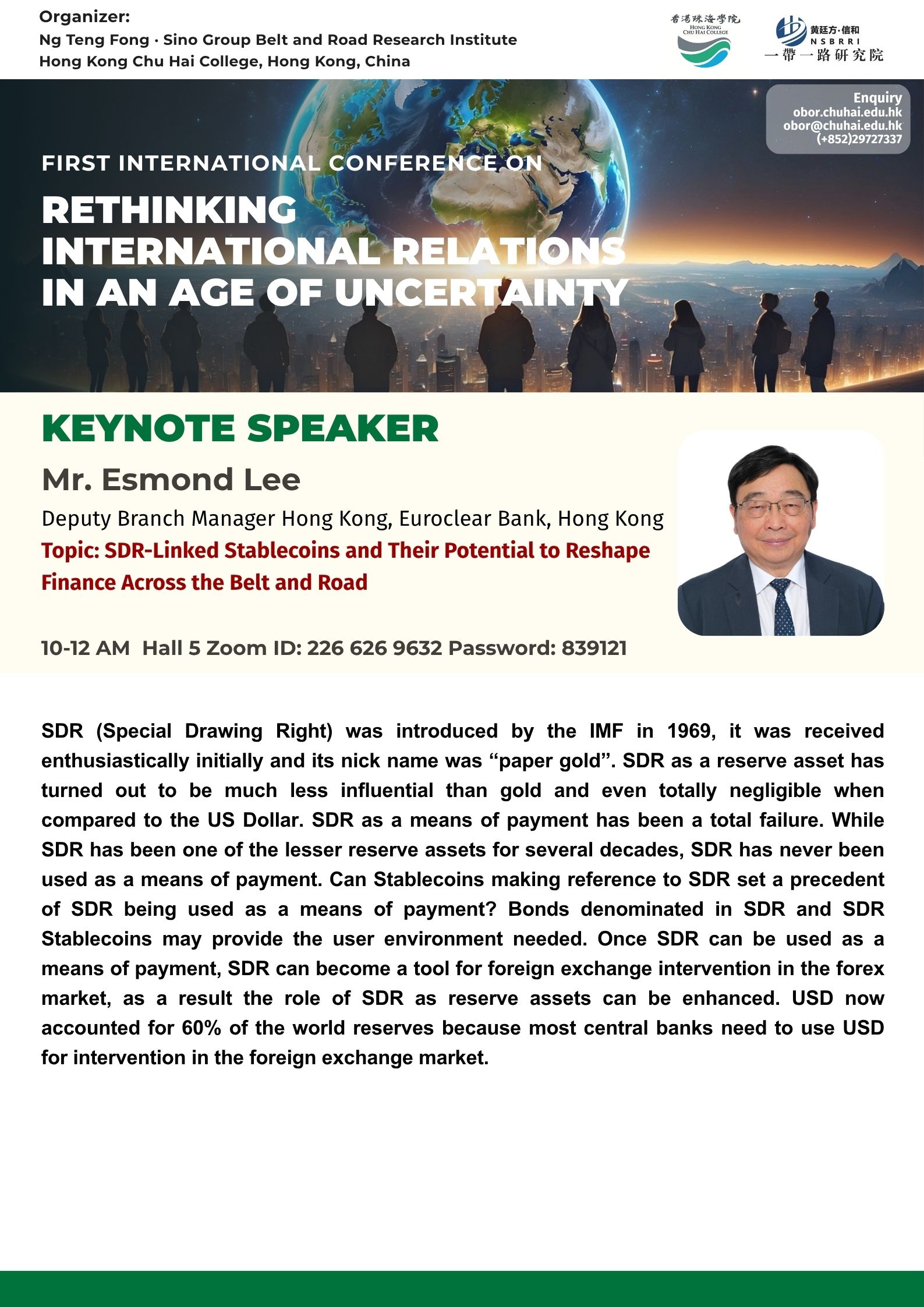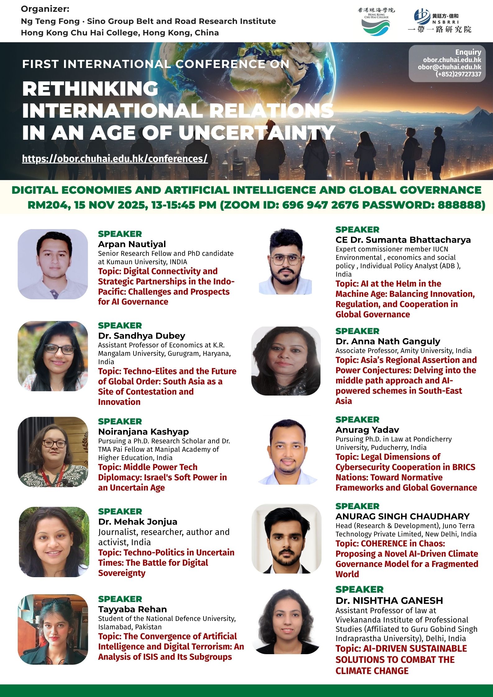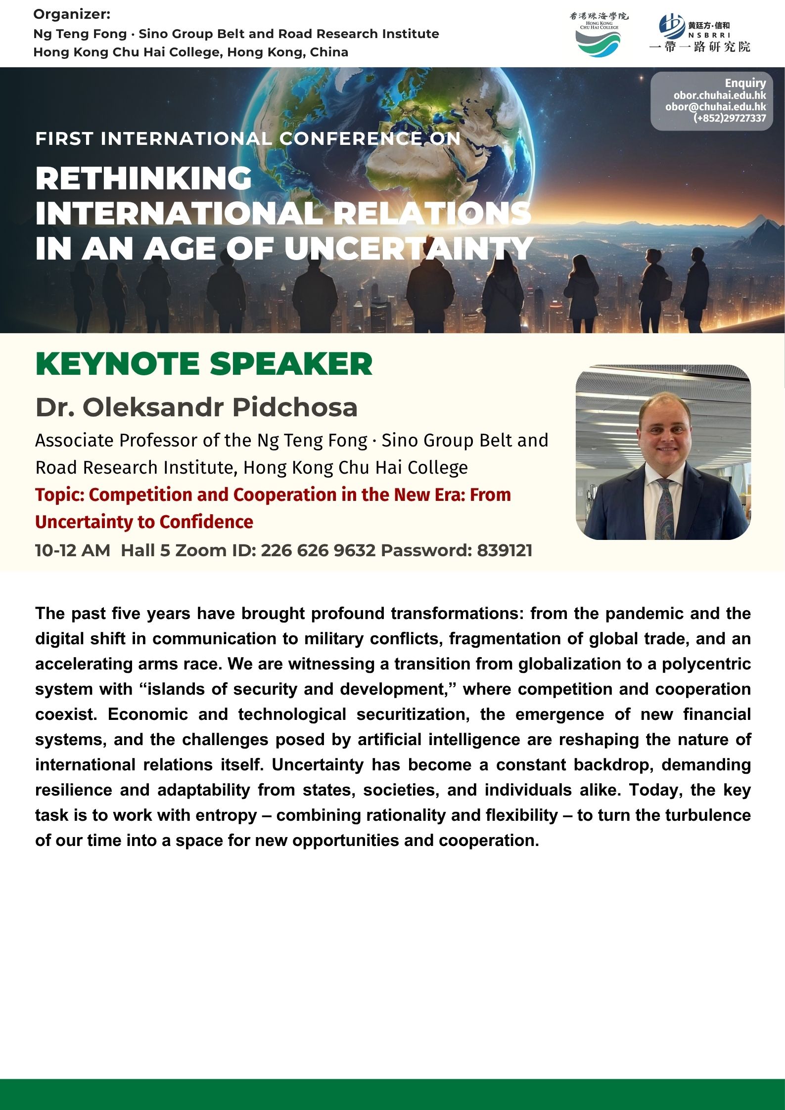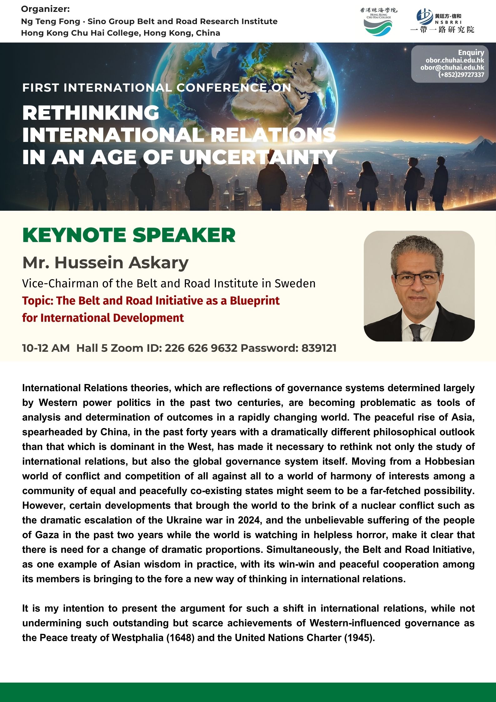 ——————————— Audiences Registration for the Conference We are delighted to offer free participation for all audience members at the First International Conference on Rethinking International Relations in an Age of Uncertainty. There are no registration fees for attending either in person or online, ensuring broad accessibility to this enriching academic event. To secure your spot as an audience member, please complete the registration form below: Audience Registration In-Person Attendance: Early registration is highly recommended to facilitate planning. The deadline for in-person registration is 12 November 2025. Upon successful attendance, we will issue an official Certificate of Participation to acknowledge your engagement. Online Attendance: Registration remains open beyond this date. We will distribute the access code and Zoom links for all sessions closer to the conference dates (14–15 November 2025). Panel links will be shared with all registered audience members. In line with our mission to foster open dialogue and knowledge exchange, we invite you to share the Zoom session links with your professional network to amplify the conference’s reach and impact. Should you have any inquiries or feedback, please do not hesitate to contact us at obor.events@chuhai.edu.hk ——————————— Information Kit for Overseas Participants Please download the information kit for your reference: Information Kit ——————————— Collect Presenter’s Materials For accepted presenters, please upload your presentation materials to the google form before 30 Oct 2025 17:00: https://forms.gle/uPFd6ro64UrRejiS6 ——————————— Visa Application For applying a visit/ transit visa/entry permit for Hong Kong SAR, applicant may submit their application by one of the following means: Online Submission Click here for online submission of application and uploading of supporting documents. Other Means of Submission Completed application forms, i.e. ID 1003A and ID 1003B (if applicable), and all supporting documents can also be submitted by the applicant or the local sponsor in either one of the following ways. All the forms must be duly completed and signed. For an applicant under the age of 16, it must be signed by the parent or legal guardian of the child.